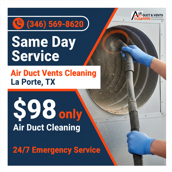 Schedule your air duct cleaning appointment today with La Porte TX Air Duct Vents — enjoy cleaner air, same-day service, and a free estimate!